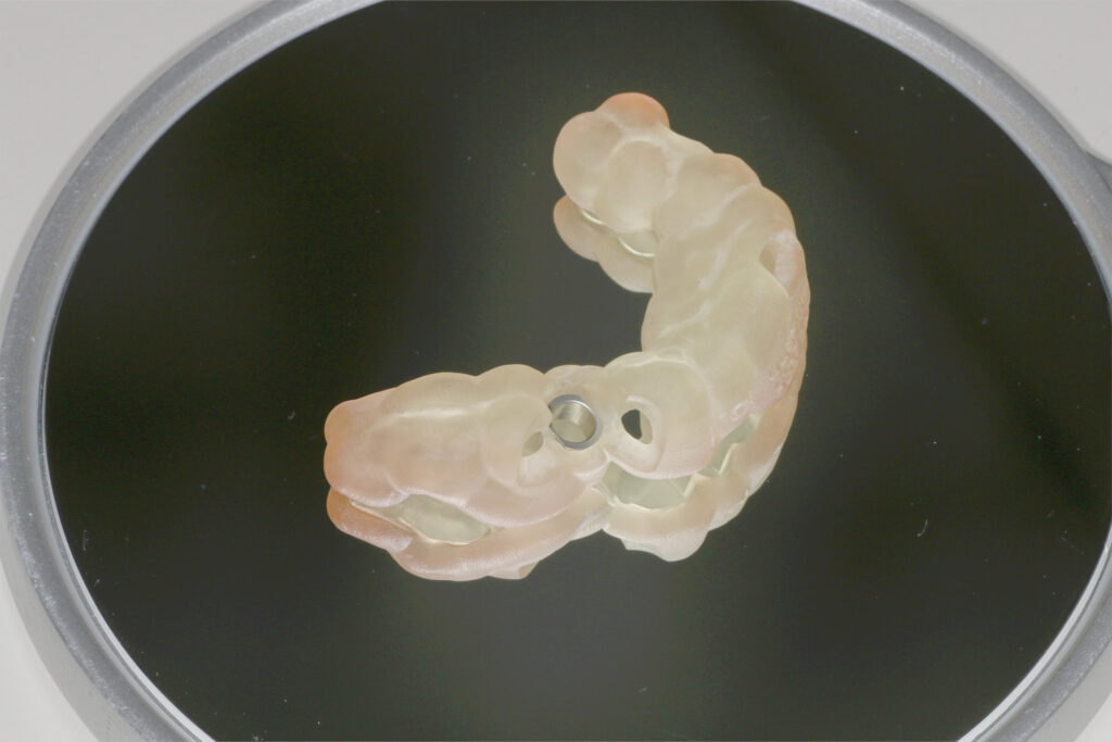 安全かつ的確な位置にインプラントを入れるシミュレーションが終わったら、そのシミュレーション通りに手術をできるようにする専門的な器具(インプラントガイド)を作成して、実際のお口の中で使用できるか試し合わせをします。